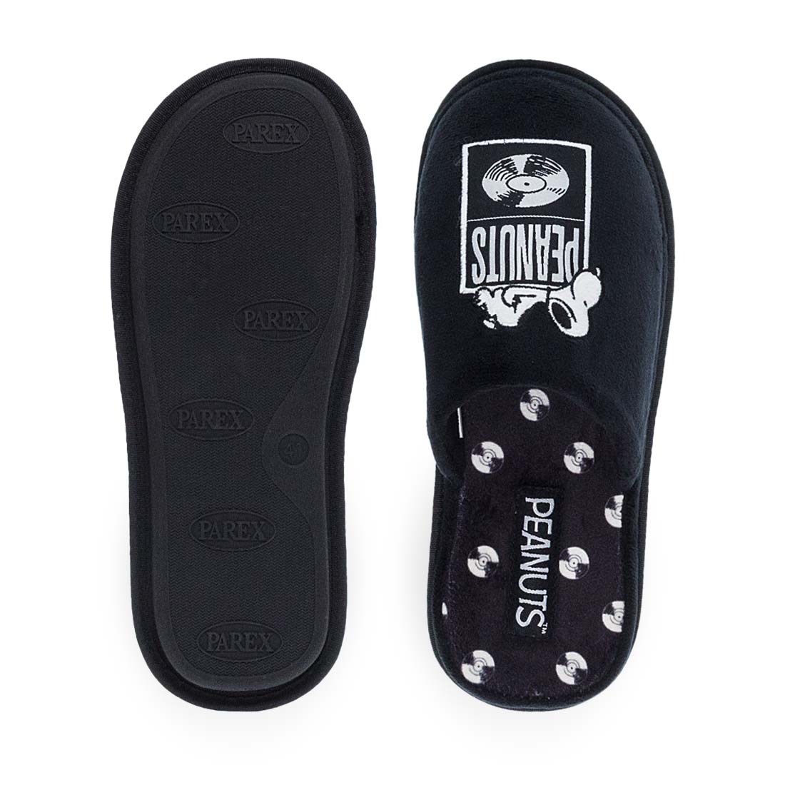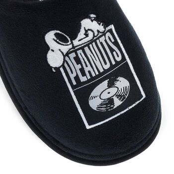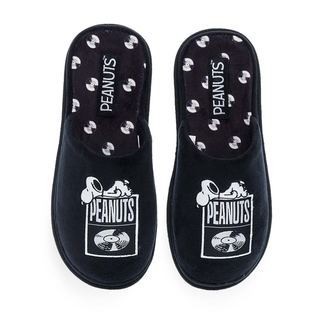 Ανδρικές παντόφλες σπιτιού Peanuts. Ανδρικές παντόφλες Snoopy Peanuts σε μαύρο και γκρι χρώμα με στάμπα δίσκου βινυλίου, εσωτερικό με μοτίβο και μαλακό πάτημα για στυλ και άνεση.