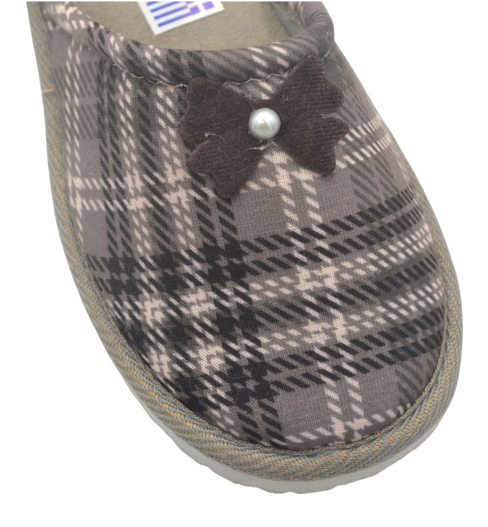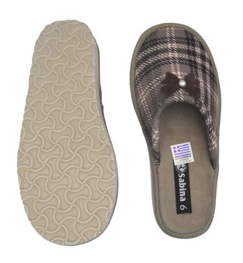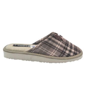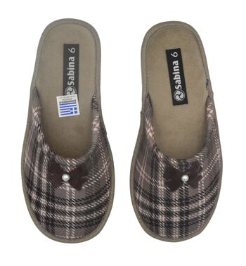 Υφασμάτινες παντόφλες σπιτιού Sabina, διαθέσιμες σε ροζ και γκρι χρώμα. Με διακριτικό καρώ σχέδιο . Mαλακές και ζεστές παντόφλες, ιδανικές για να διατηρήσουν τα πόδια σας ζεστά και ξεκούραστα. Έχουν στενή εφαρμογή, προτείνουμε ένα νούμερο μεγαλύτερο.
